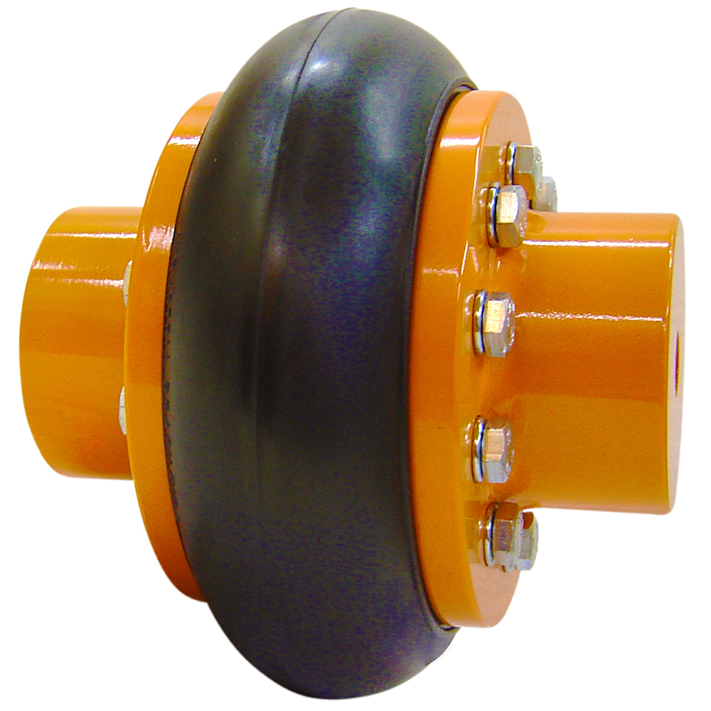 O acoplamento é fabricado com cubos em ferro fundido GG-25 e elemento elástico em borracha sintética com dureza entre 80 e 85 Shore, garantindo alta resistência mecânica e durabilidade. O material é resistente ao contato com óleo e suporta variações de temperatura entre –20 °C e +100 °C, mantendo o desempenho mesmo em condições severas de operação.
